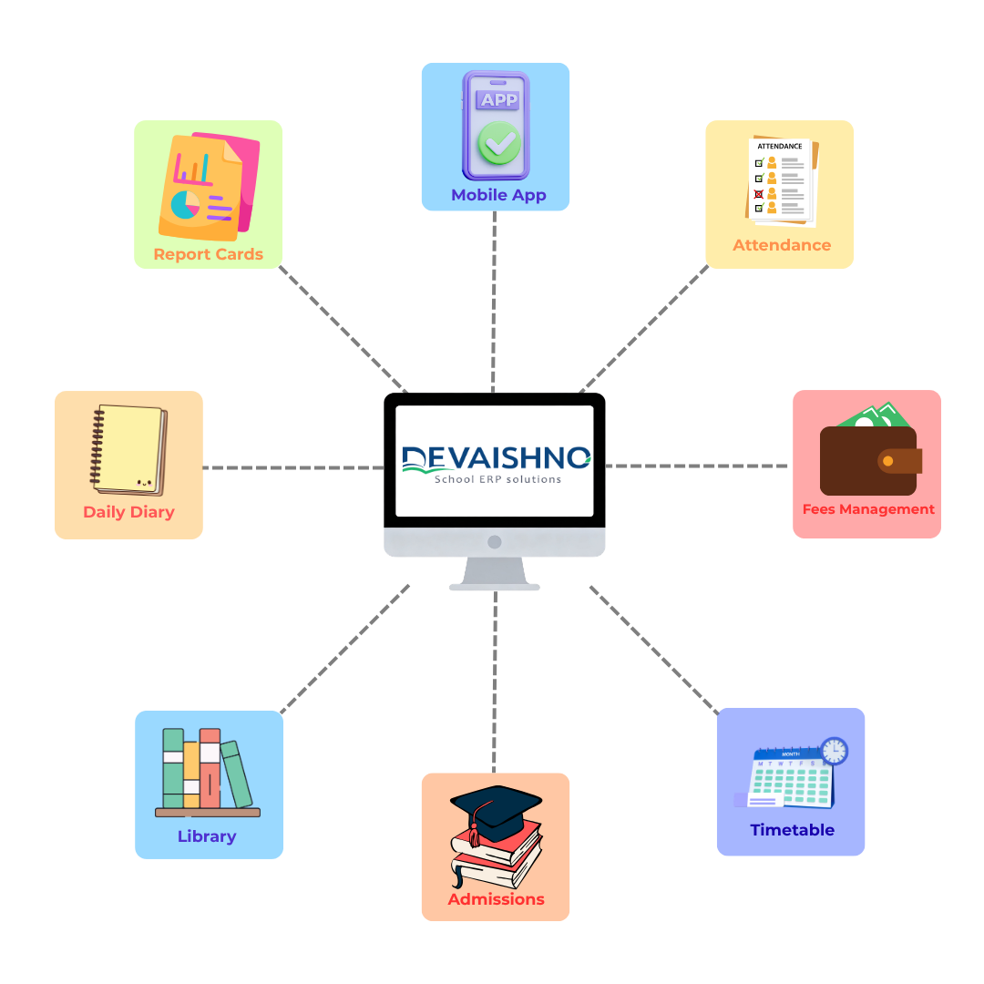 Devaishno School ERP Solutions is available with fully integrated modules that are meant to encompass all aspects of school administration and school management. All the modules integrate with each other so that information input at one location was automatically updated in all other places.
